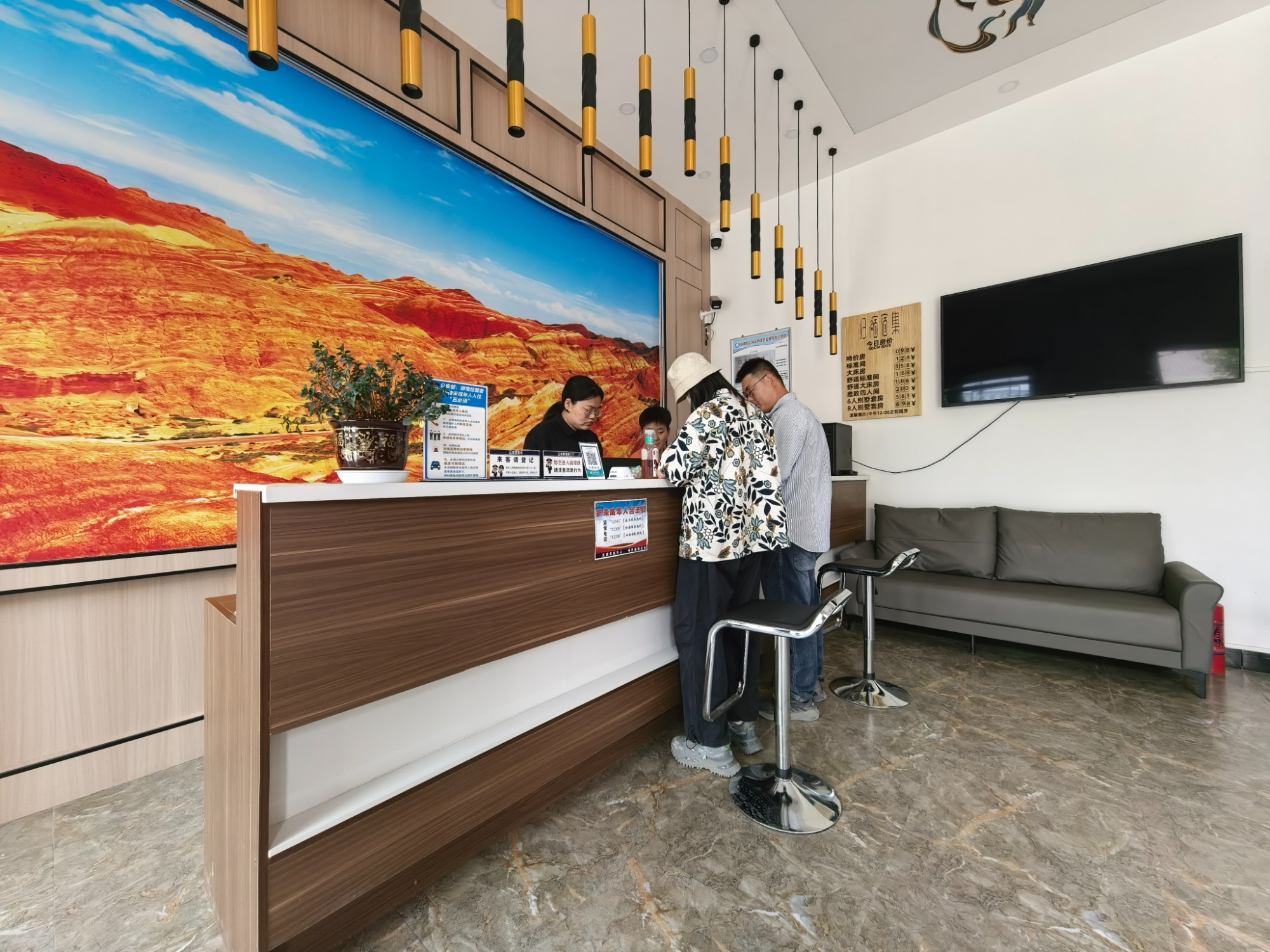 甘俊镇速展村归宿宿集游客登记入住中心内,游客正在办理入住手续(甘州区委宣传部供图)