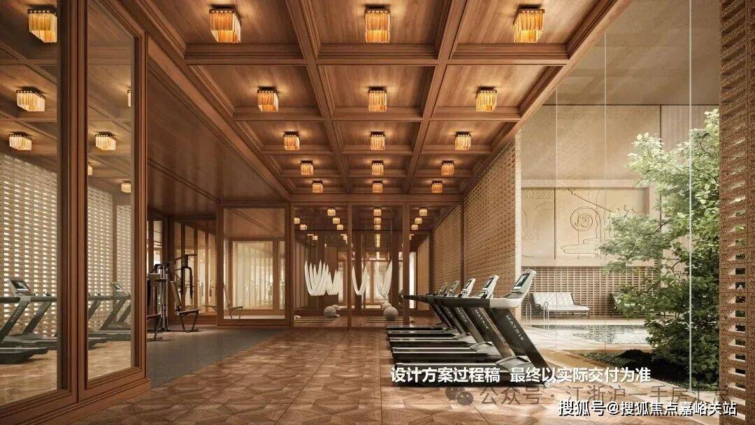 瑜伽健身区,大幅落地窗引入自然光线,天花的格栅造型,地面的复古拼花木地板,都透出浓厚的海派风情。