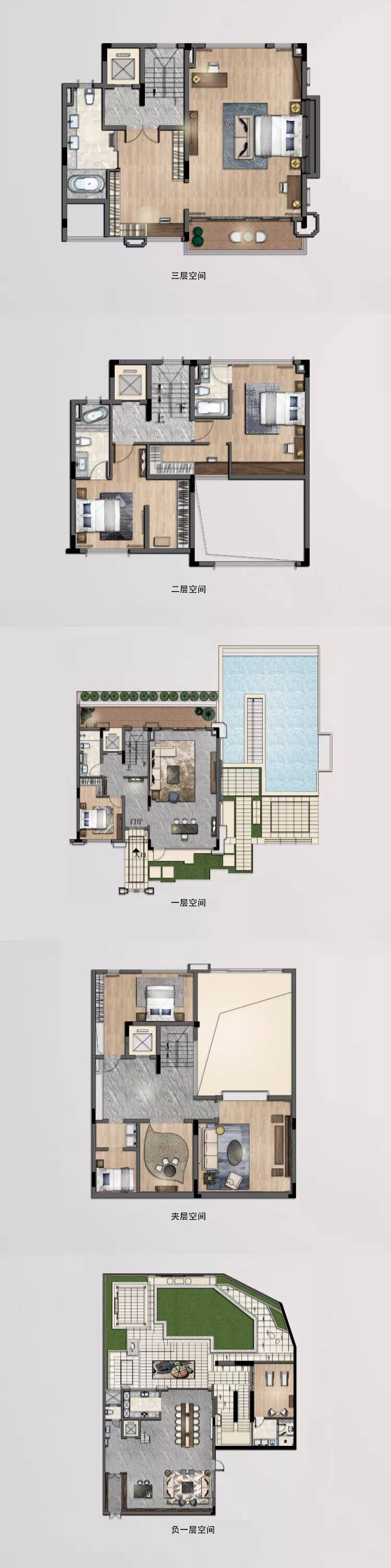 三是建面约216㎡(A户型)和樾,是万樾台最大的“墅王”户型,可做五房设计,格局为地上三层、地下两层,花园面积约220-270㎡,实用面积约450-480㎡,得房率超220%。该户型占据项目地势最高处,北向开门见山,拥有最佳的景观视野及采光,是终极置业的首选。首层设有6.8米双中空阔厅,11米大开间,空间开阔大气,彰显顶豪气质,客厅连接约207㎡的首层花园,可打造成私家泳池、户外烧烤区等,满足业主的高端社交需求;二层设有三个次卧和一个卫生间,每个房间都宽敞明亮,带有独立飘窗;三层为整层主人房,面积约105㎡,带有独立卫生间、超大衣帽间、阳光书房和露台,生活互不干扰,可俯瞰万博CBD天际线和山体景观;地下两层全明采光,5.4米挑高阳光层,可随兴趣打造为私人会所、健身房、家庭影院等多功能区域,中西结合的厨房和餐厅,充分包容每位家人的饮食偏好;下沉式庭院约177㎡,朝向自然山体,山景园林相互呼应,带来多层次的景观视野。